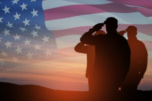 Home > Skills > Merit Badges > Scouts BSA Test Lab > Military Service & Veterans > Silhouettes of soldiers saluting on a background of USA flag. Greeting card for Veterans Day, Memorial Day.